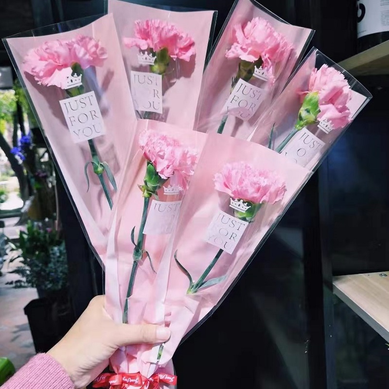 花材: 1支粉色康乃馨,透明玻璃纸,精美包装。请数量选择15及以上