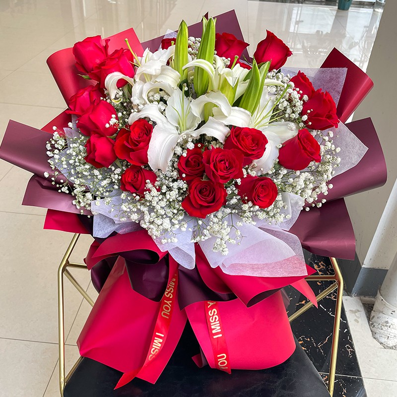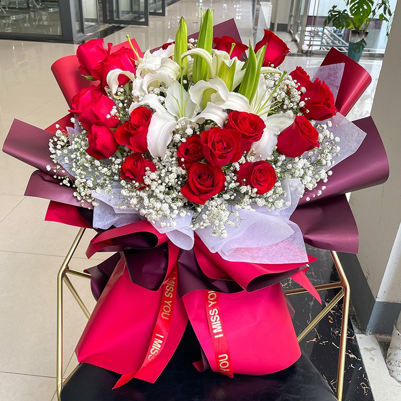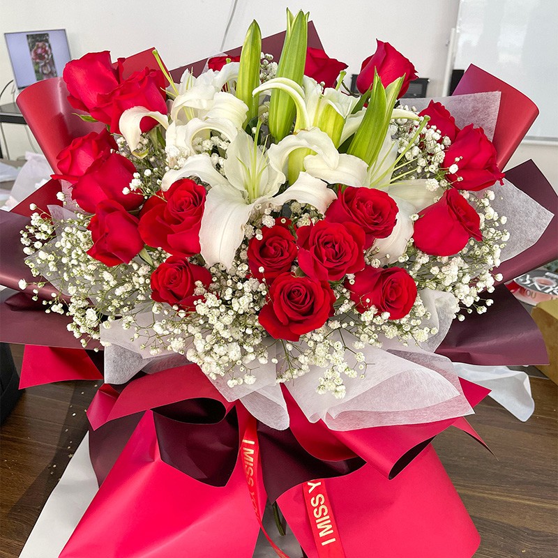 花材: 19朵红玫瑰,3支多头白色香水百合,搭配满天星装饰。