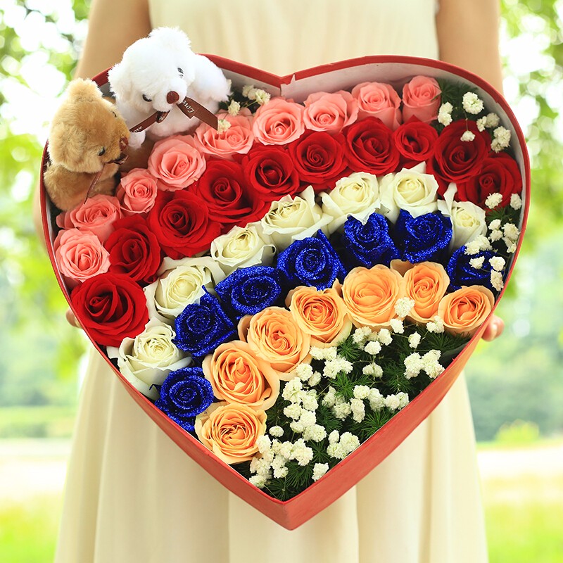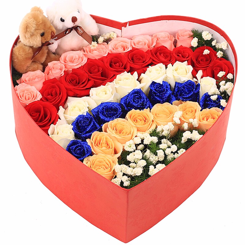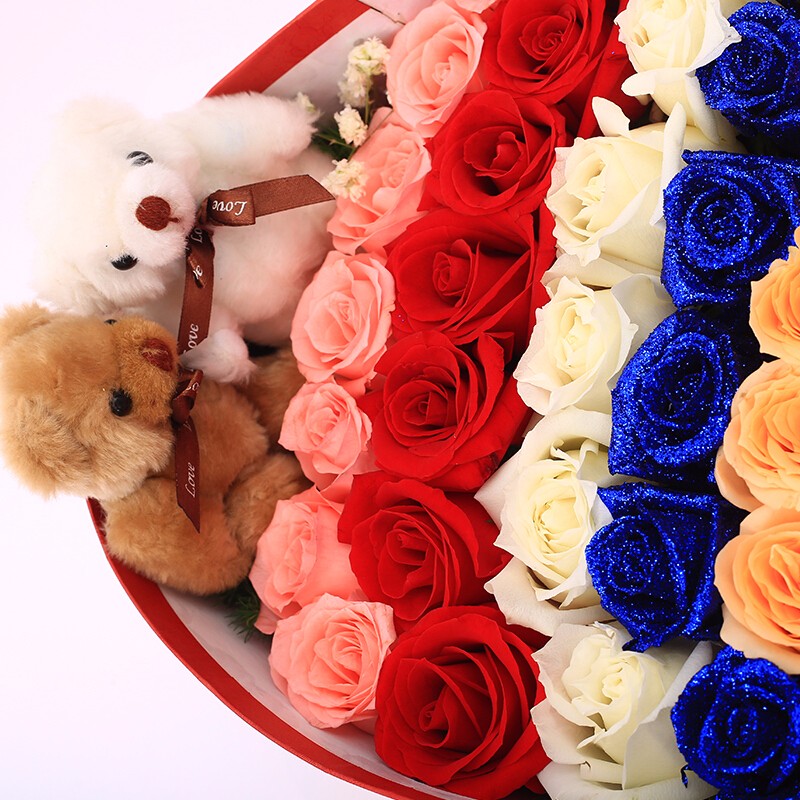 花材: 40朵精品混色玫瑰(粉玫瑰、红玫瑰、白玫瑰、蓝色妖姬、香槟玫瑰)依次围边造型,2只可爱小熊,搭配白色满天星、天冬门装饰。