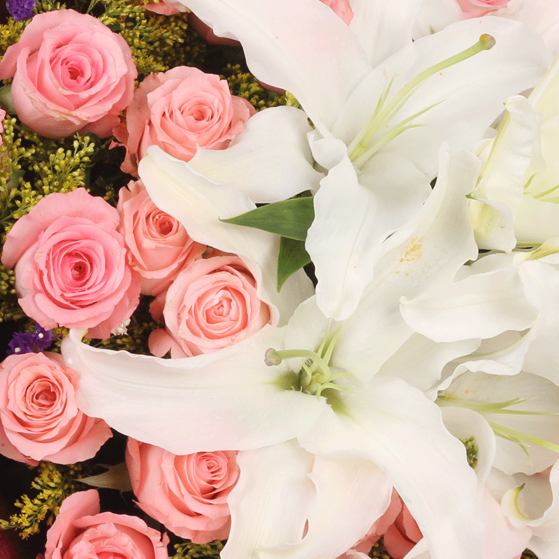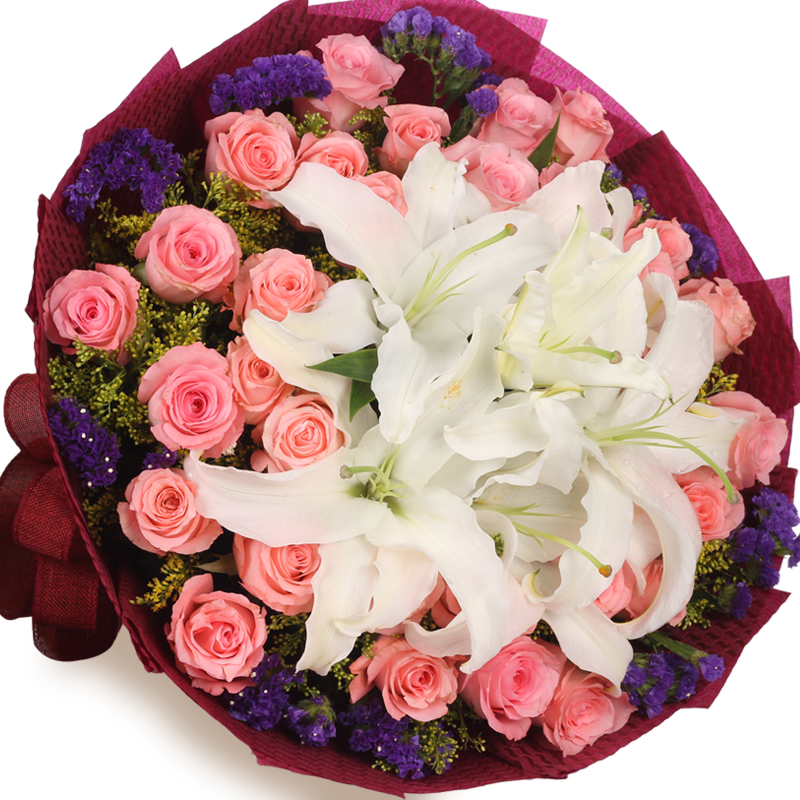 花 材:精选33朵粉玫瑰,6朵香水百合,搭配黄莺、勿忘我间插点缀。