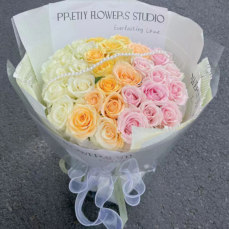 花材: 33朵渐变色玫瑰(白色、香槟色、粉色),搭配1条珠串。