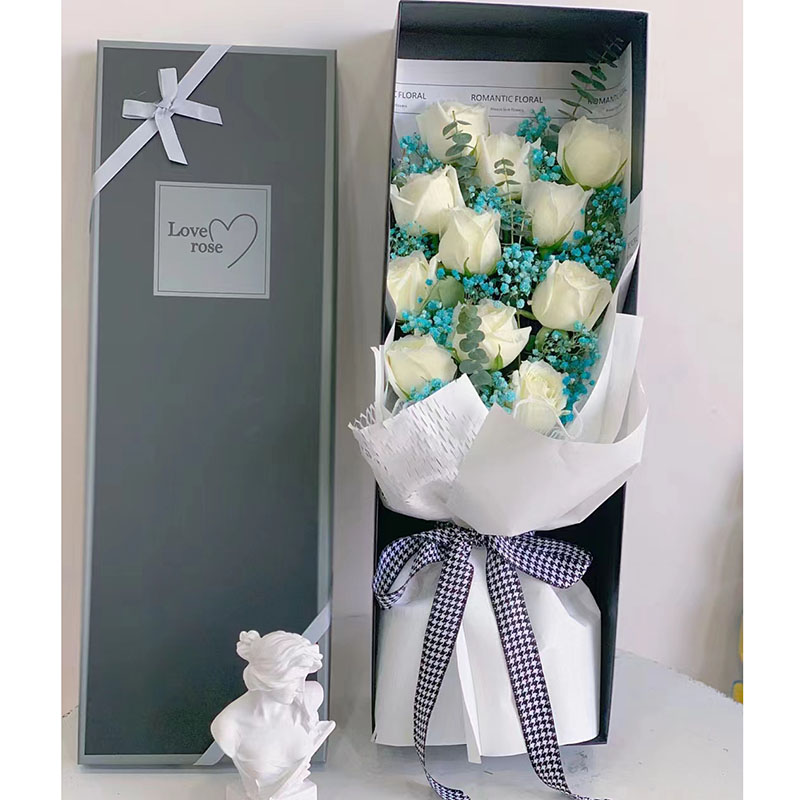 花材: 11朵白玫瑰,搭配蓝色满天星装饰。