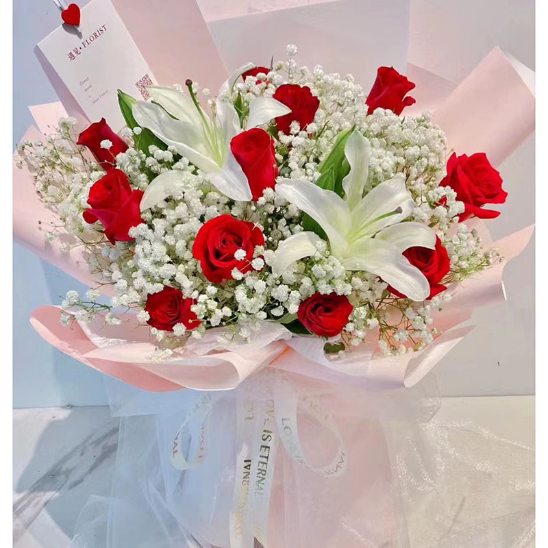 花材: 11朵红玫瑰,2支白色多头香水百合,搭配满天星、尤加利叶装饰。