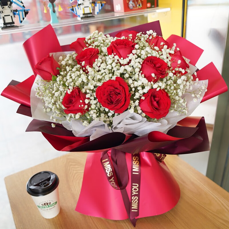 花材: 11朵红玫瑰,满天星丰满装饰。