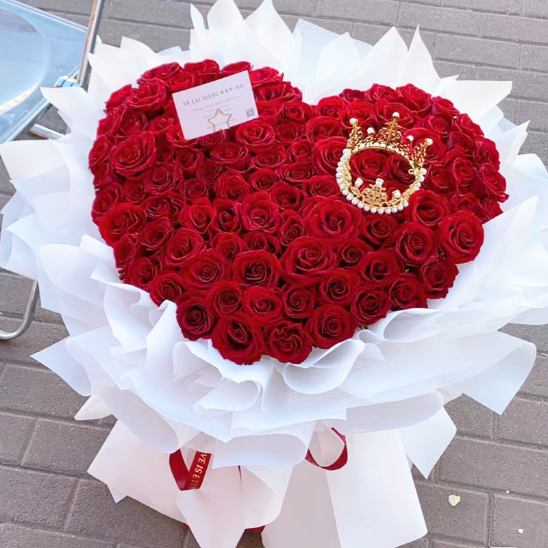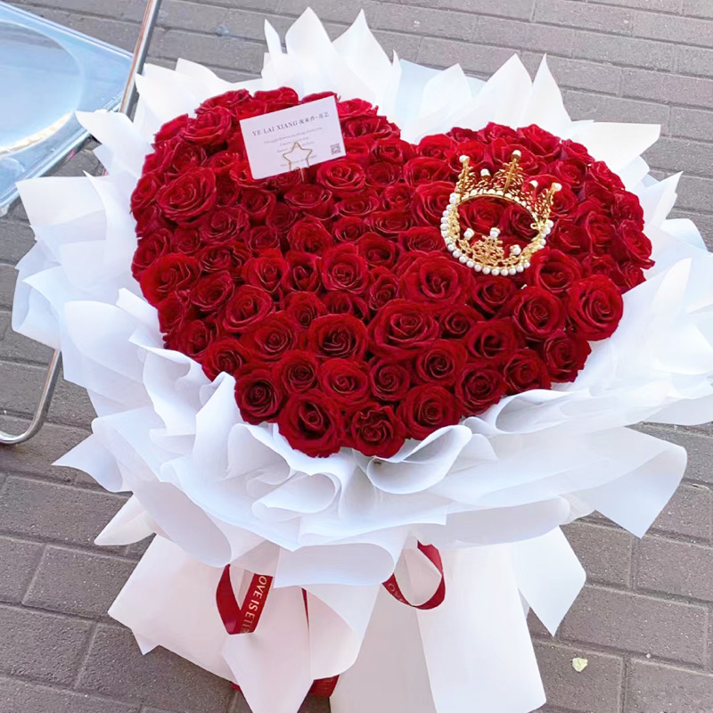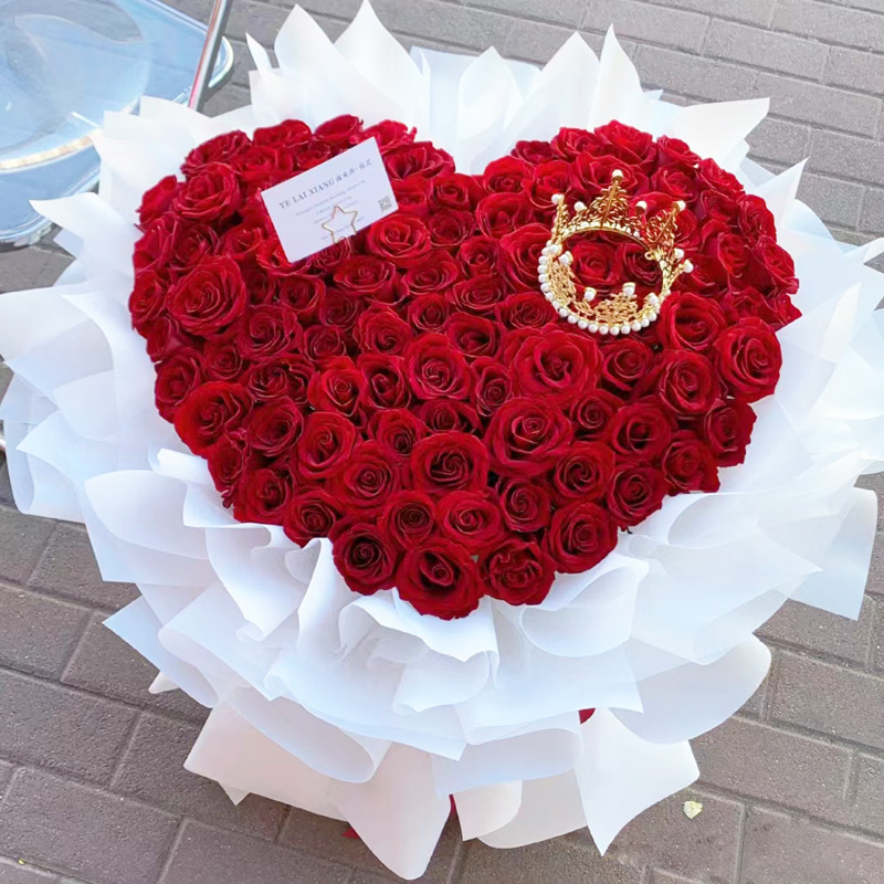 花材: 精选99朵红玫瑰,花型心形造型,搭配皇冠装饰。