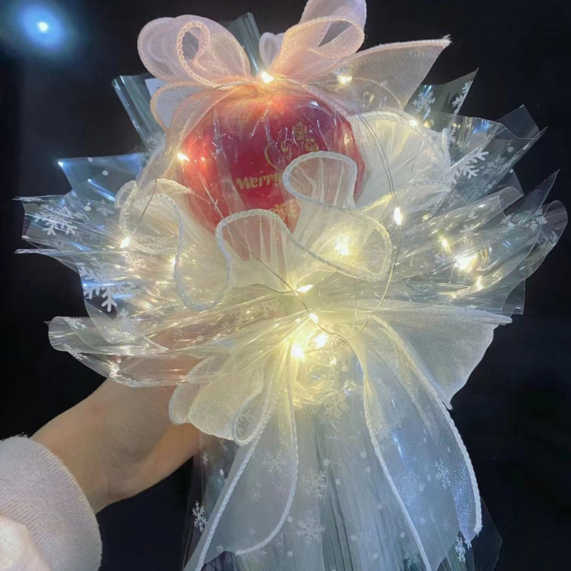 花材: 1颗苹果,头顶蝴蝶结,1串灯串,如图包装。