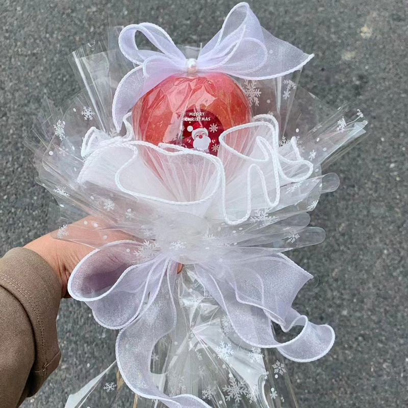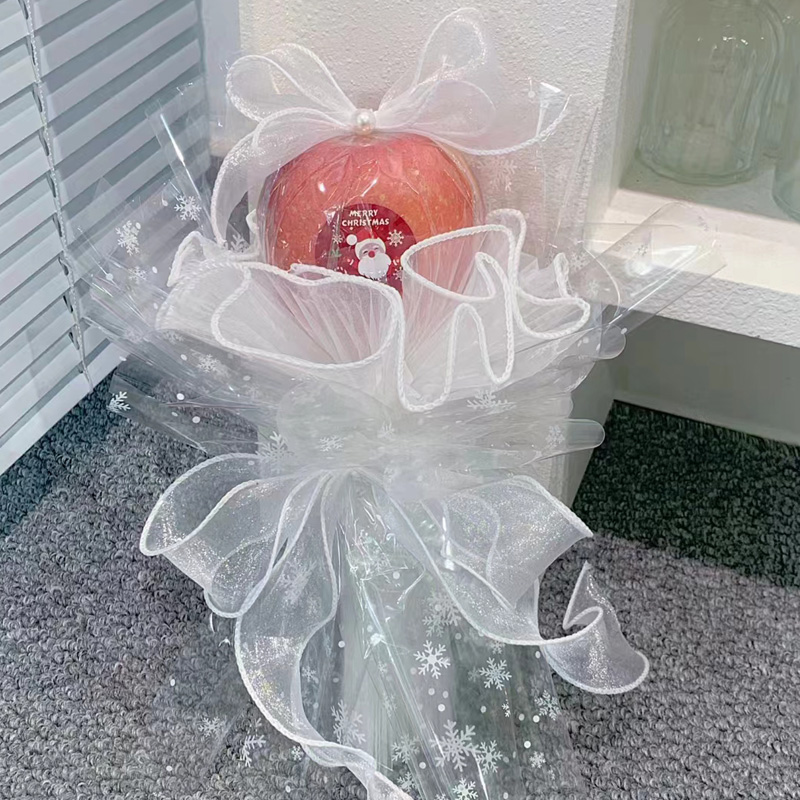 包装: 玻璃纸包裹苹果,气球托支撑,波浪纱内包,雪花玻璃纸多层外包,白色缎带花结。