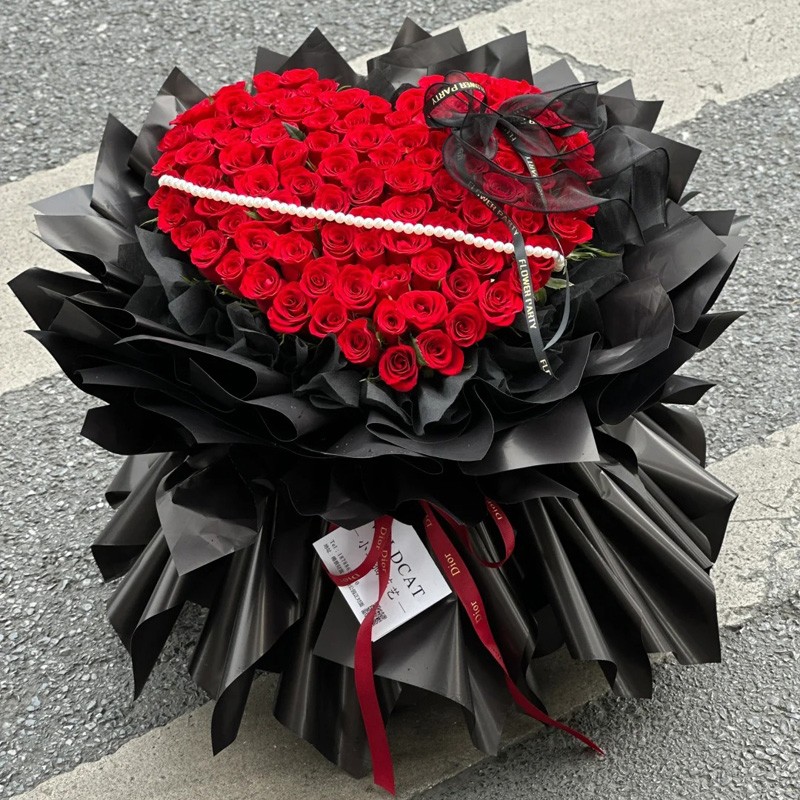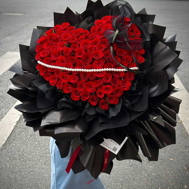 花 材:99朵红玫瑰心形造型,1条珠串,1朵黑色缎带蝴蝶结装饰花面。