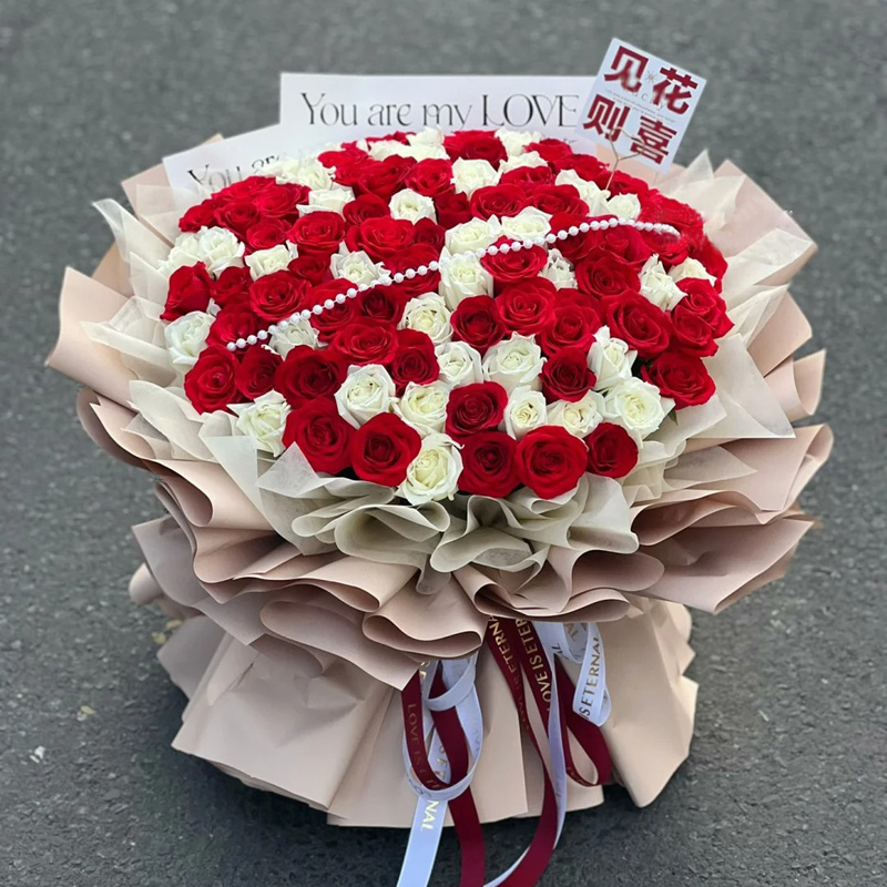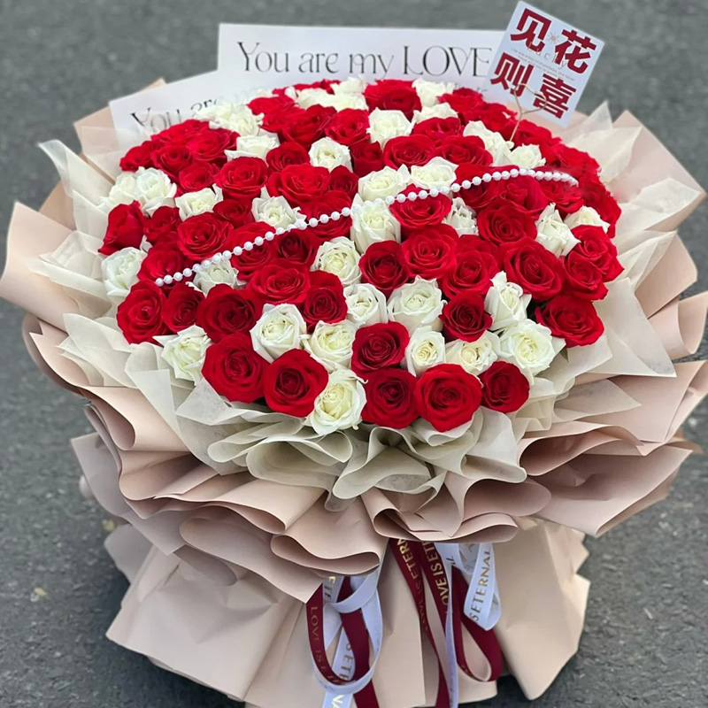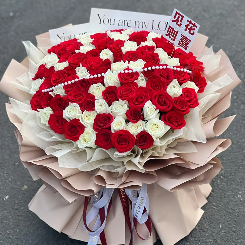 花材: 精选红玫瑰,白玫瑰共99朵,珠串装饰花面。