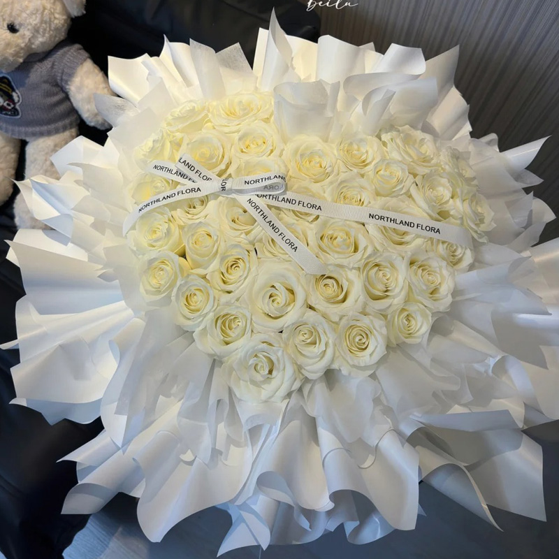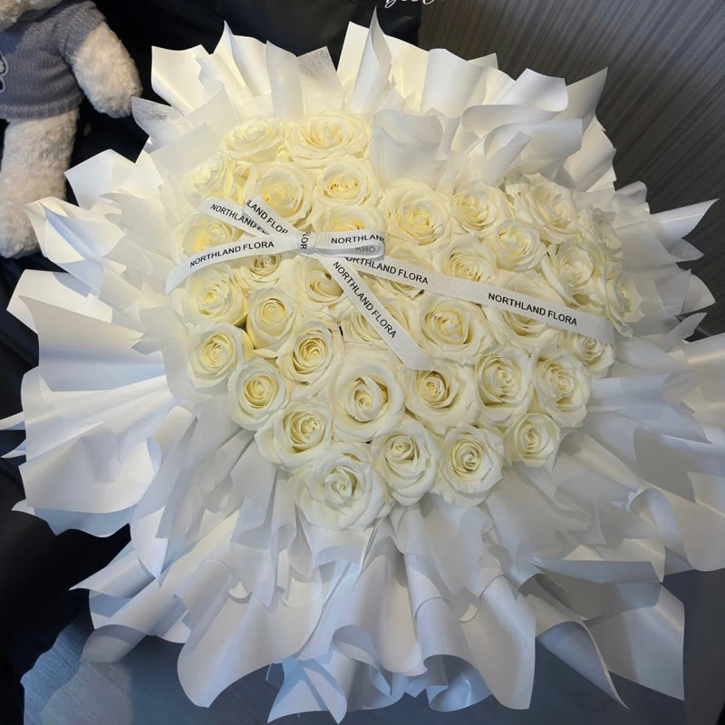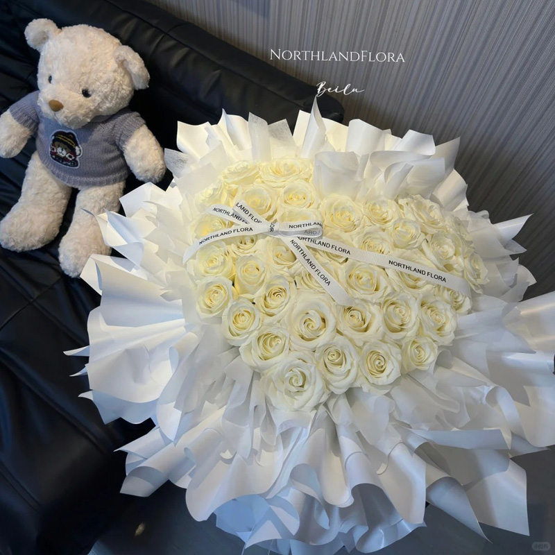 花 材:精选36朵白玫瑰,心形造型,白色缎带系蝴蝶结装饰花面。