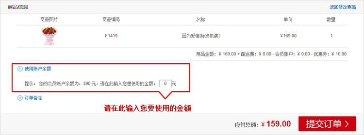 如果您要使用您的会员账户中的余额,只须在填写订单时填写您要使用的金额,即可从订单总额中自动扣除相应货款。