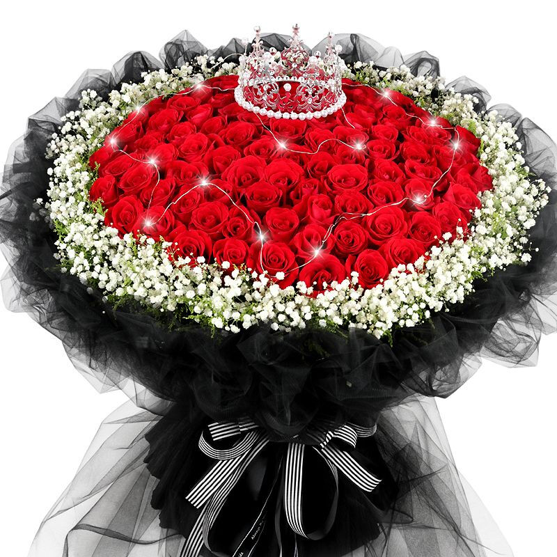 • 花材99支顶级红玫瑰心形造型,1个皇冠(款式随机),满天星环绕。