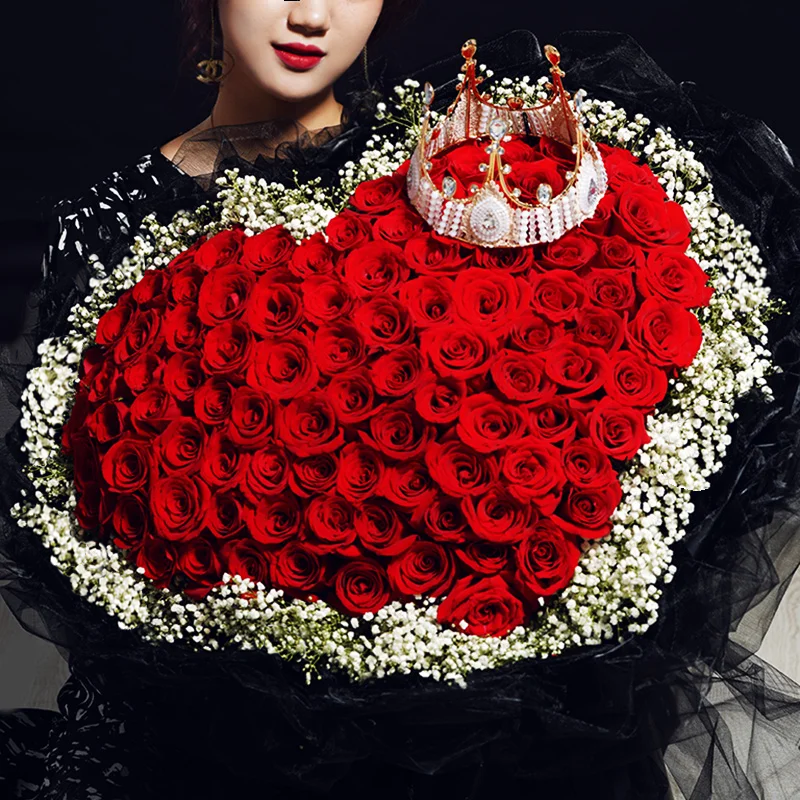 • 花材99支顶级红玫瑰心形造型,1个皇冠(款式随机),满天星环绕。