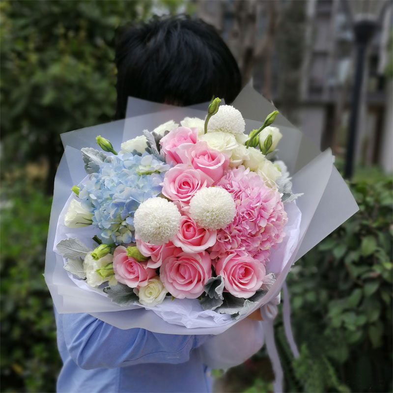 • 花材两只绣球花,9支顶级粉色戴安娜,搭配大量桔梗、乒乓菊、银叶菊。