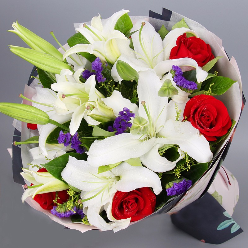 - 思念的幸福 - 6支红玫瑰,4支多头白百合,搭配适量勿忘我、栀子叶。