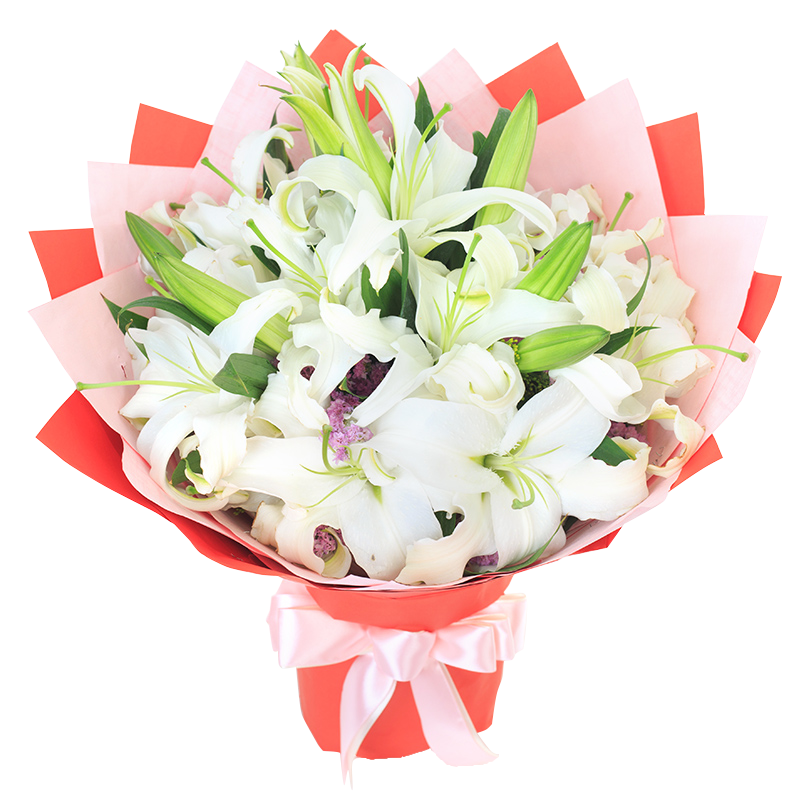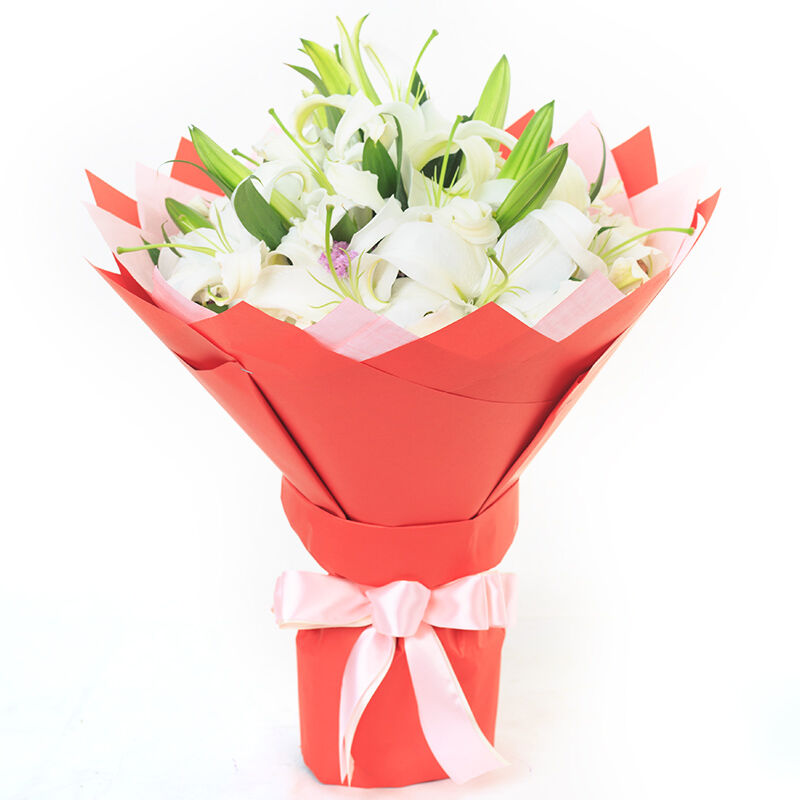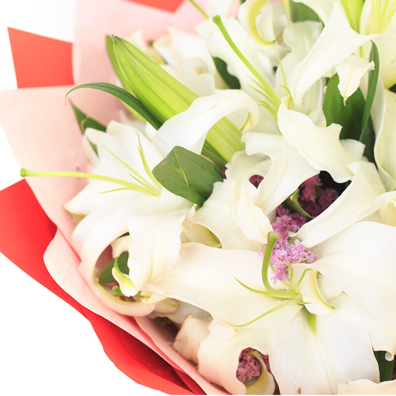 • 花材24朵白百合,紫色小花、黄莺草点缀。