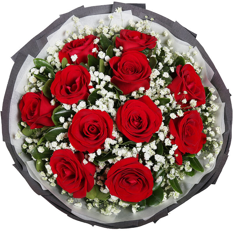 满满的爱 - 11支精品红玫瑰,搭配适量白色满天星、栀子叶