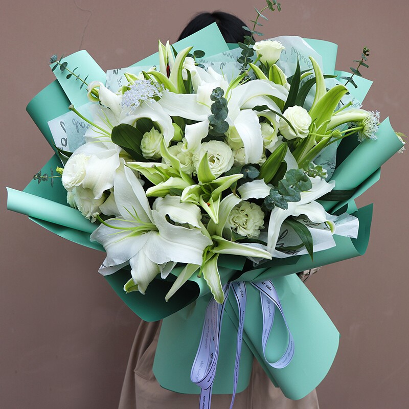 - 花材11朵精品白玫瑰,4支白色多头香水百合,搭配白色洋桔梗、尤加利叶装饰。