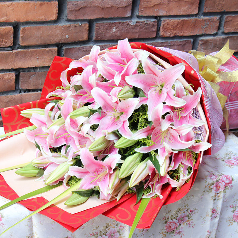一网情深 - 精心挑选11枝多头香水粉百合,黄莺点缀,搭配剑叶。