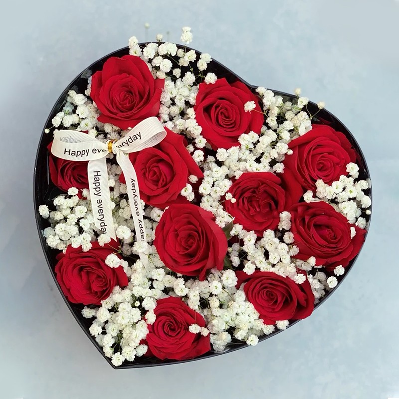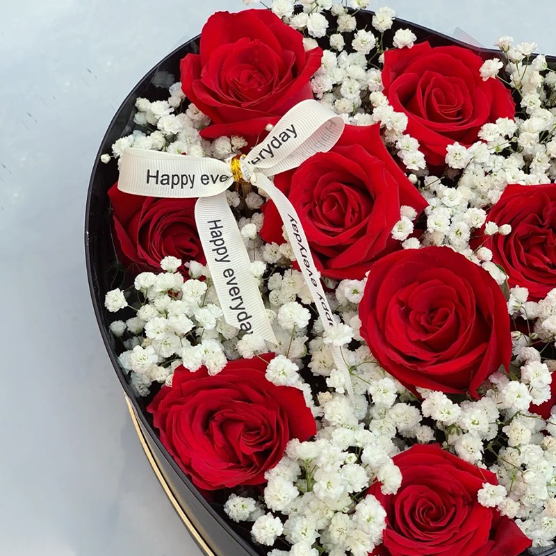 • 花材11朵红玫瑰,1个蝴蝶结装饰花面,满天星丰满间插。