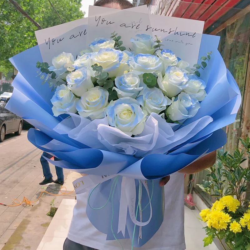 • 花材19朵碎冰蓝玫瑰,尤加利叶间插装饰。