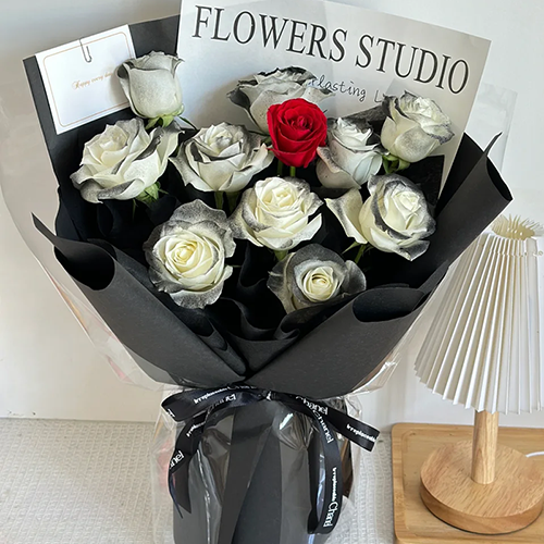 【黑骑士-偏爱】精选10朵黑骑士玫瑰,1朵红玫瑰。