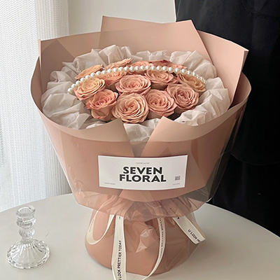 【难忘旧时光】精选13枝卡布奇诺玫瑰,1条珠串,白色纸内衬,同色系小香风包装。