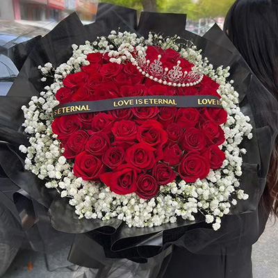 【相爱到永远】精选52朵顶级红玫瑰,1顶皇冠(款式随机),白色满天星环绕,黑色英文缎带装饰花面。