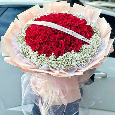 【风过蔷薇】精选52朵红玫瑰,白色满天星外围环绕,白色英文缎带装饰花面。