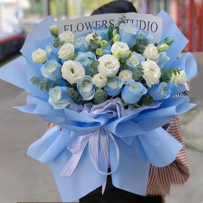 花 材:15枝碎冰蓝玫瑰,5枝多头白桔梗,尤加利叶间插点缀。