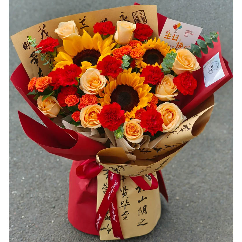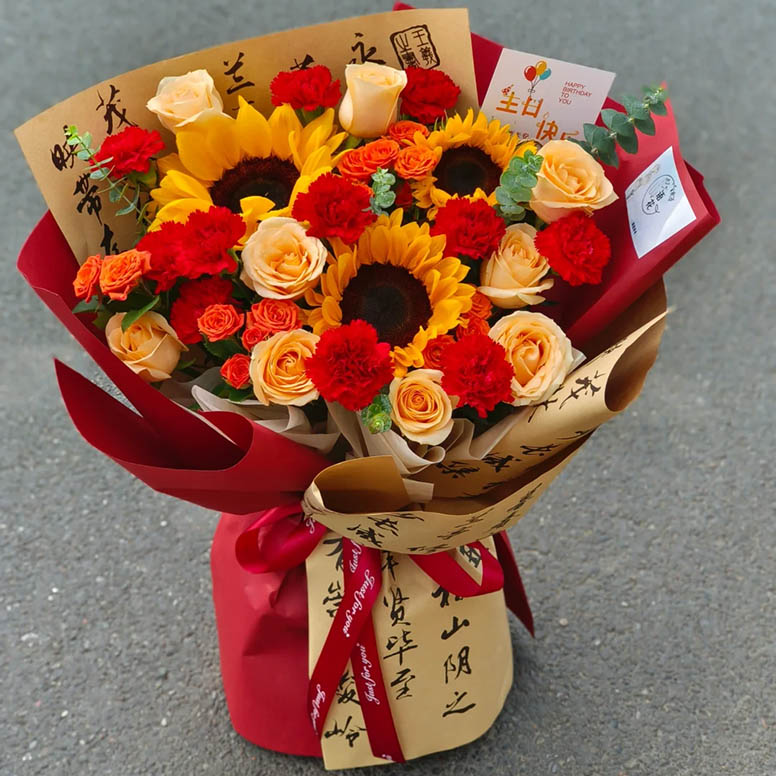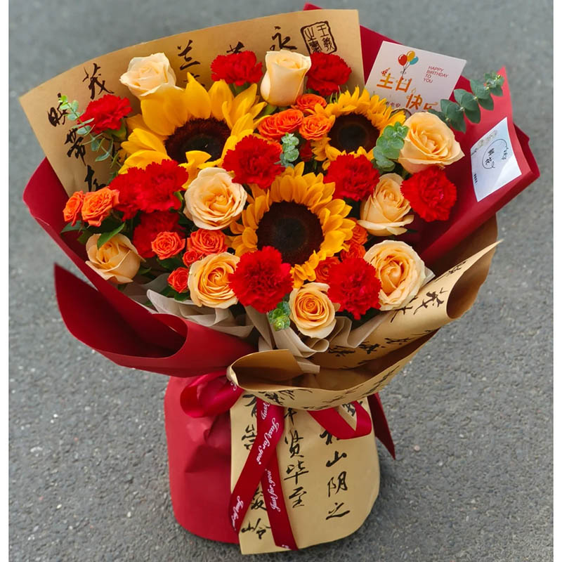 花材: 3枝精品向日葵,19朵红色康乃馨和香槟玫瑰混搭(红色康乃馨10枝,香槟玫瑰9枝),3枝多头橙色泡泡,搭配尤加利叶装饰。