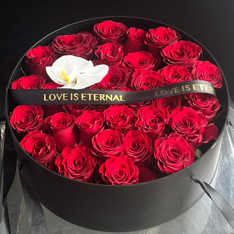 花 材:精选33枝红玫瑰,1朵蝴蝶兰,黑色英文缎带装饰花面。