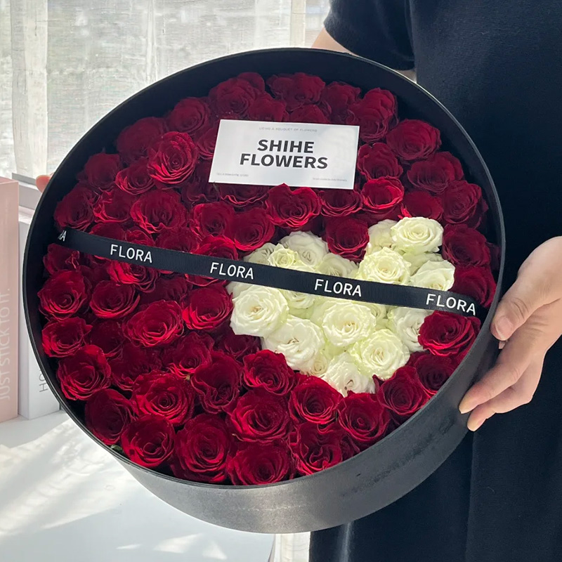 花材: 精选60枝红玫瑰,15枝白玫瑰(白玫瑰心形造型),一条缎带装饰花面。