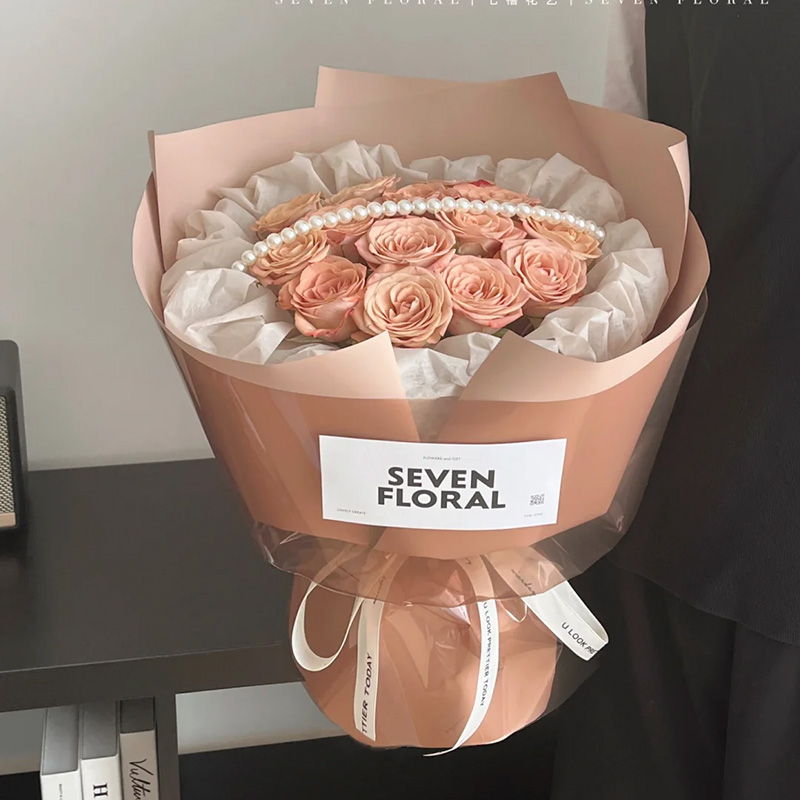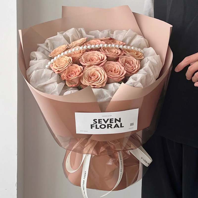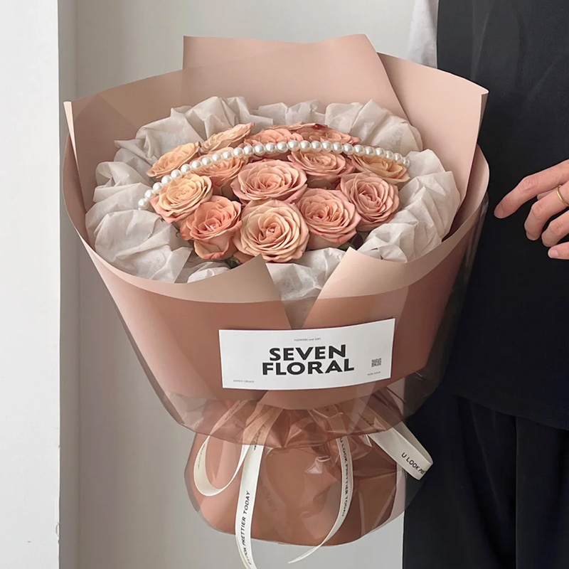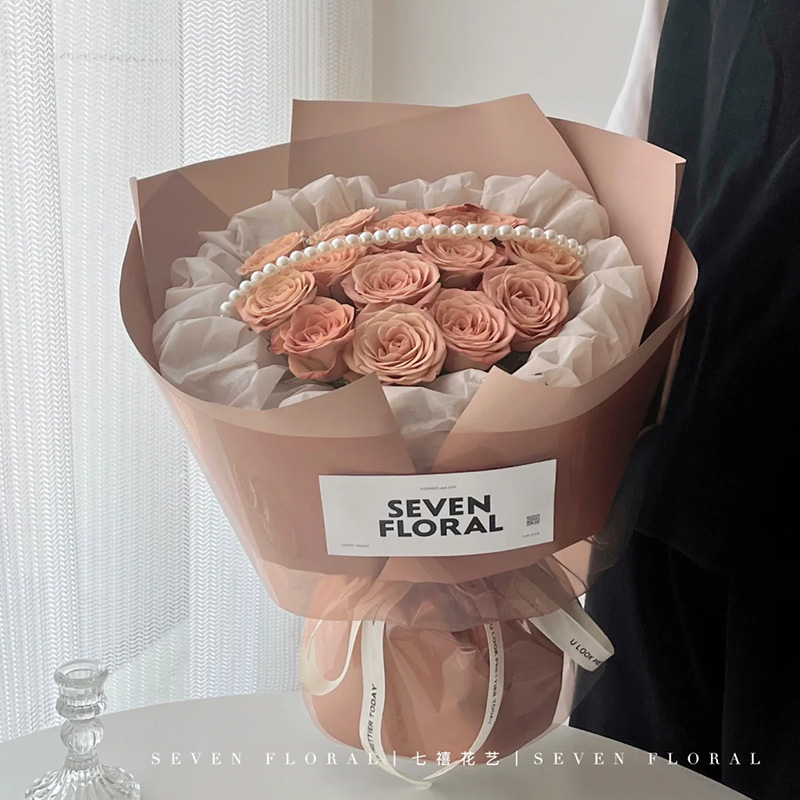 花 材:精选13枝卡布奇诺玫瑰,1条珠串,白色纸内衬,同色系小香风包装。