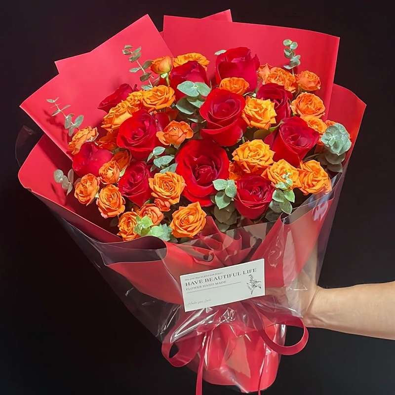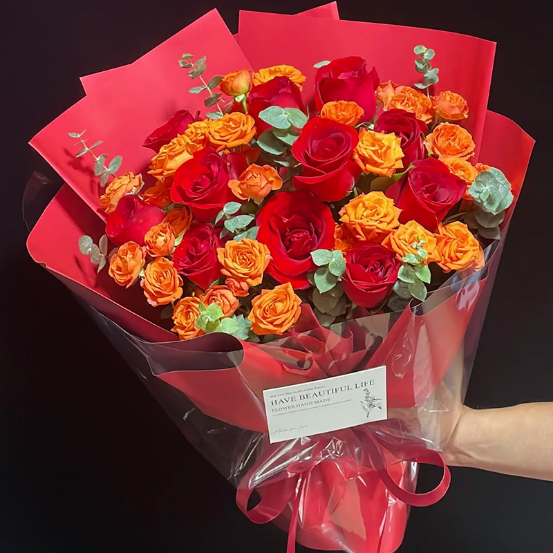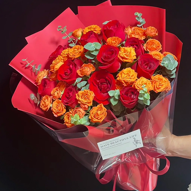 花材: 11枝红玫瑰,6枝多头橙芭比,搭配尤加利叶装饰。
