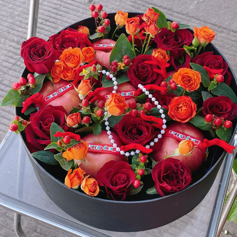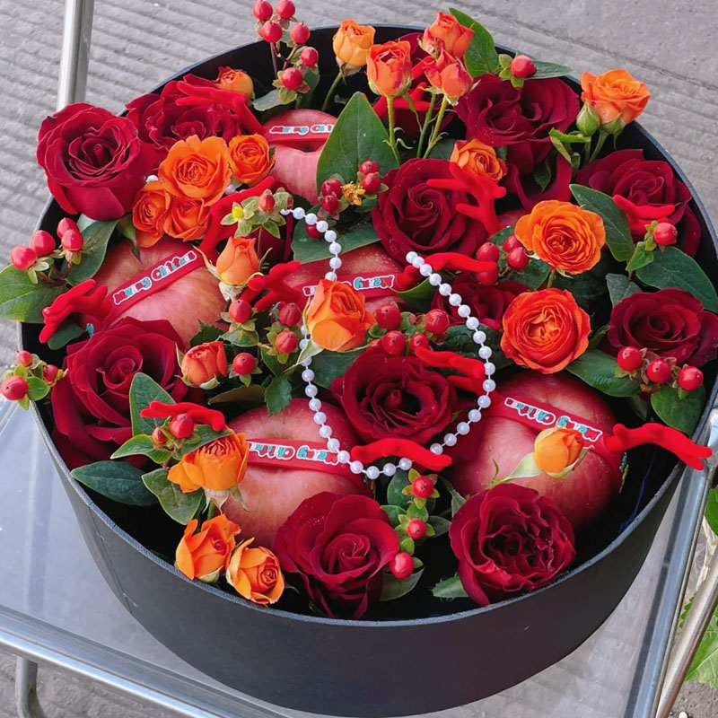 花材: 11枝红玫瑰,1条珠串,5个苹果(每个苹果用红色系丝带缠绕装饰),5枝多头橙色泡泡,红豆、尤加利叶丰满间插。